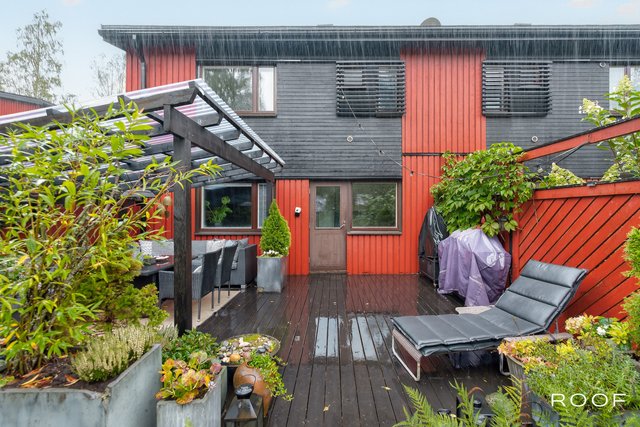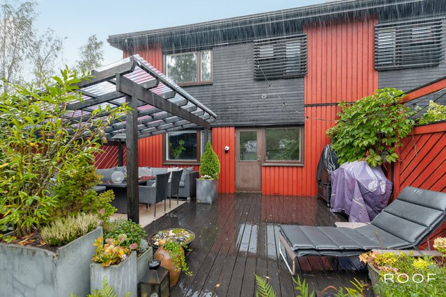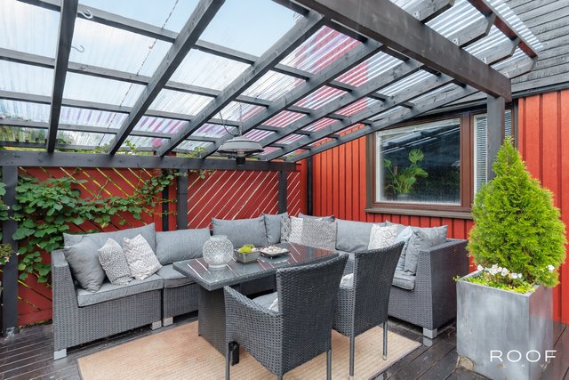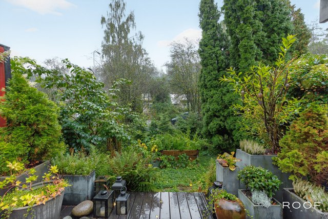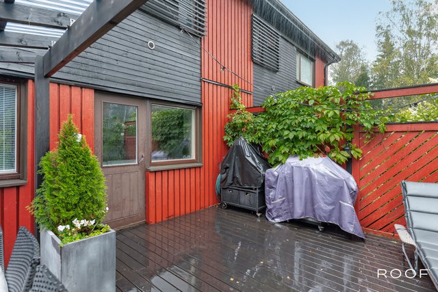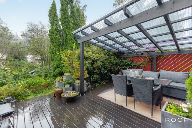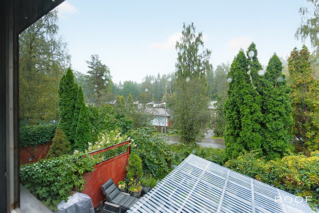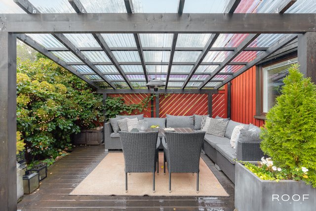 - Takapiha etelään, istutuksia, pensaita, nurmikkoa, osin katettu puinen terassialue, jonka valokate on uusittu v. 2024