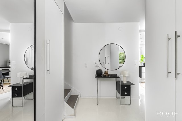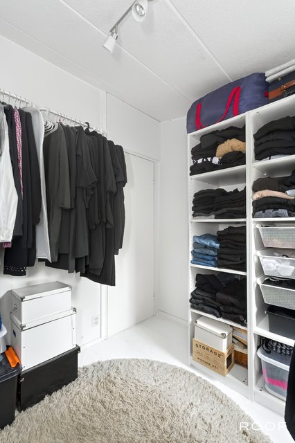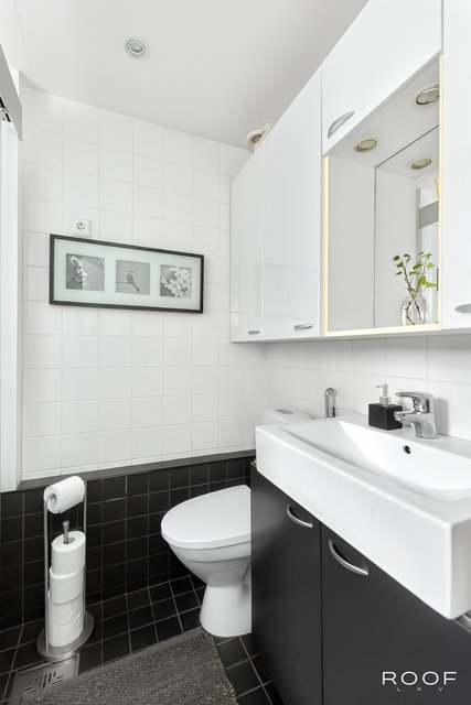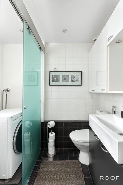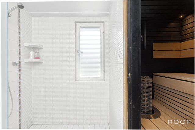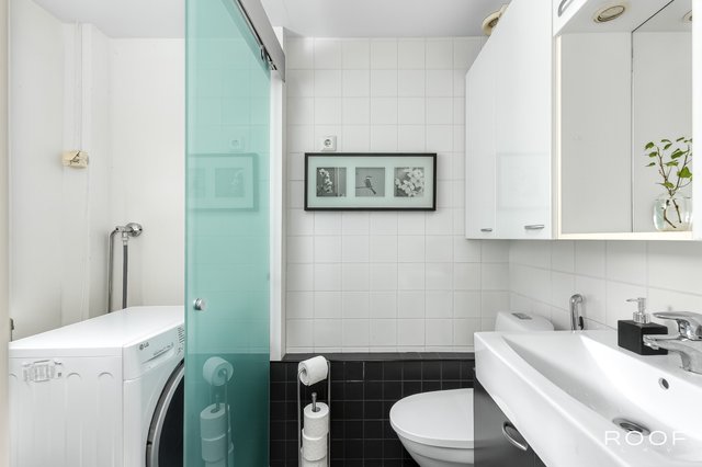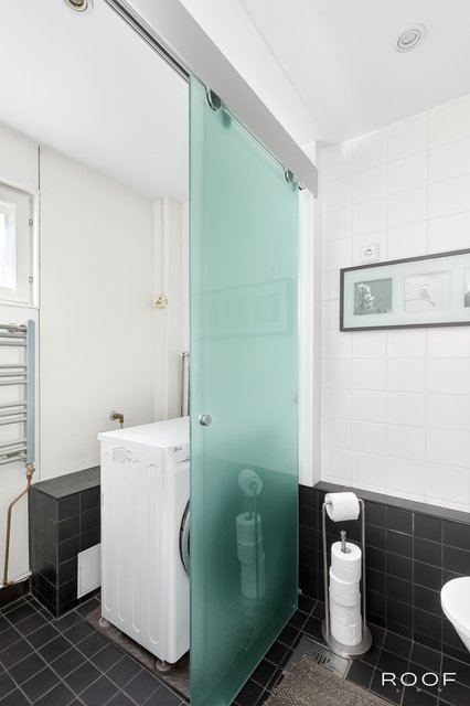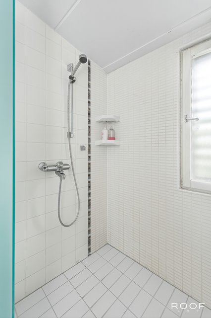 - Varustus: suihkuseinä, pesukoneliitäntä, lattialämmitys (alhaalla), wc-istuin, suihku, peilikaappi, peili, kiinteät valaisimet, kylpyhuonekaapisto, asennettuja erikoisvarusteita (maitolasiseinät ylhäällä ja alhaalla). Lattia: laatta Seinät: kaakeli