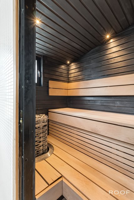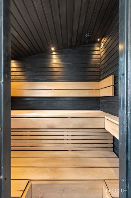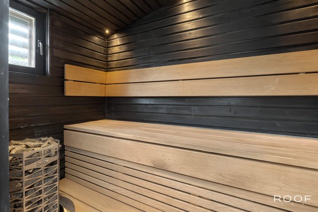 - Oma sauna, ledivalot katossa, Harvia pilarikiuas Lattia: laatta Seinät: puupaneeli Kiukaan tyyppi: sähkökiuas