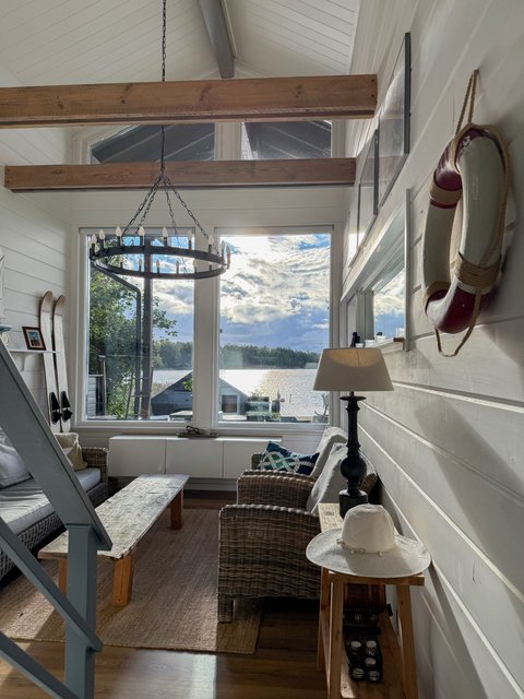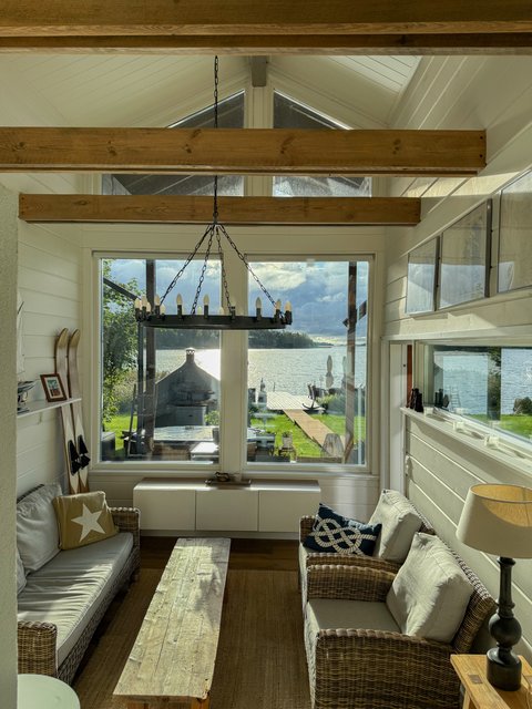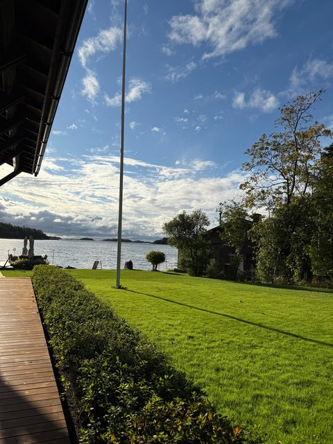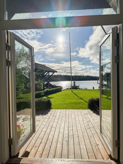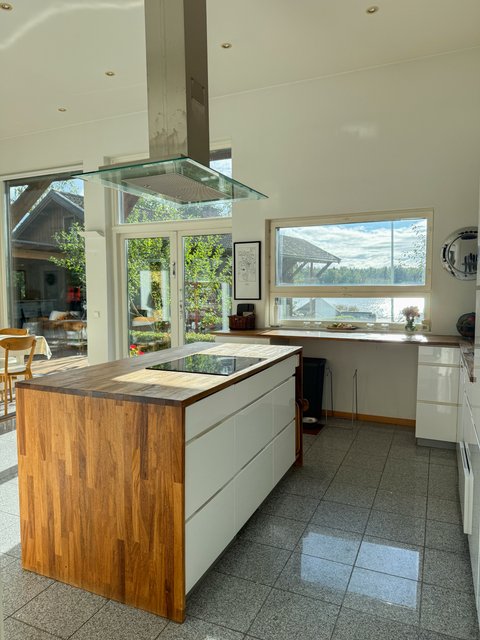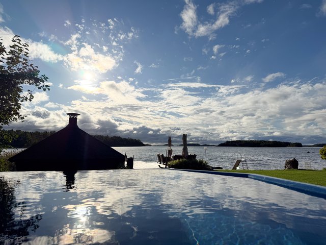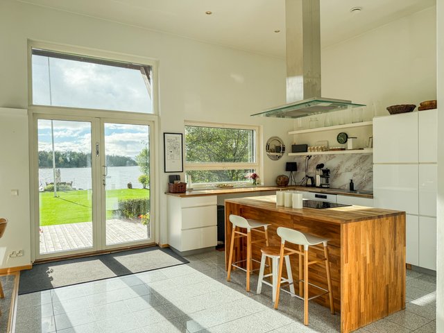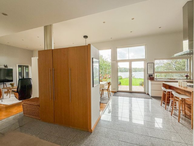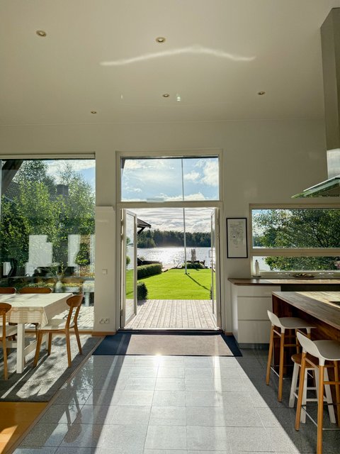 Valtavaa terassia pitkin on kulku aina omaan rantaan asti. Rannassa on upeat puitteet istuskella ja nauttia vertaansa vailla olevasta merimaisemasta. Talon ja saunarakennuksen väliin jää katettu kesäkeittiö. Saunarakennus on pisteenä iin päälle tässä upeassa kotikokonaisuudessa.