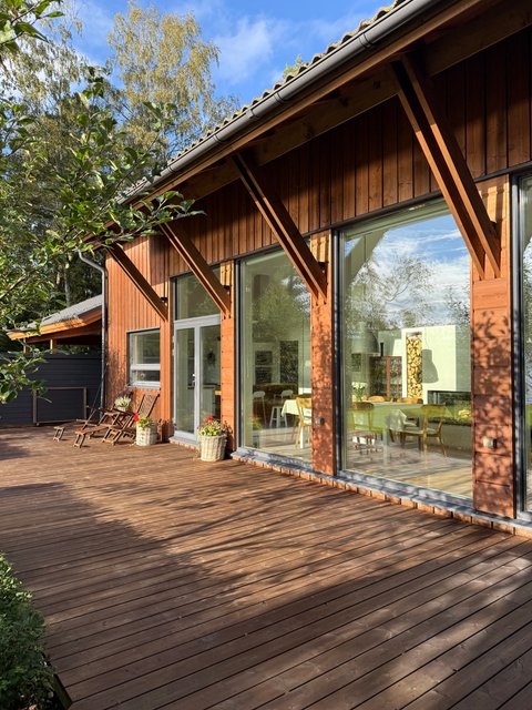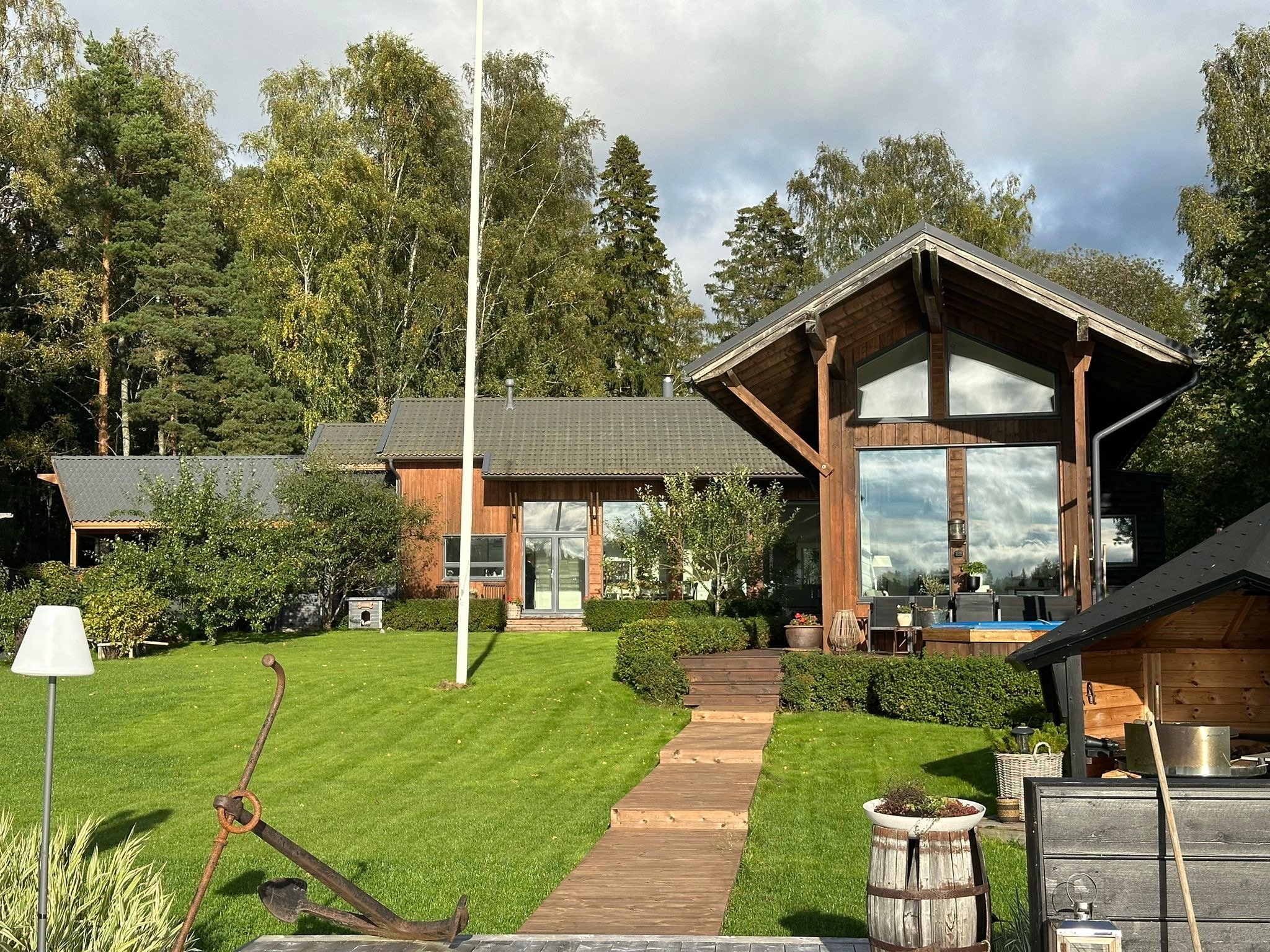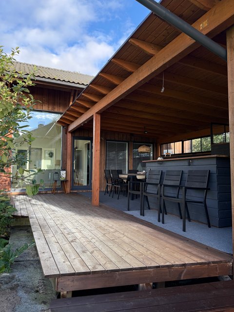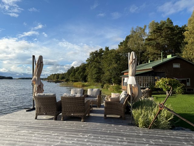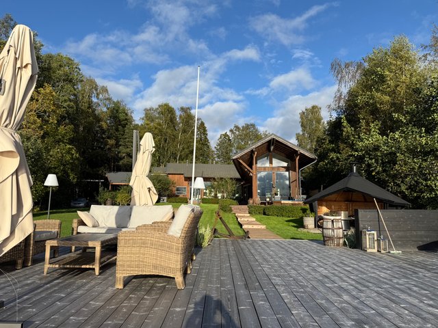 - Valtava terassi, joka kulkee aina rantaan asti. Terassilla on katettu kesäkeittiö, jossa voit kestitä vieraita tai nauttia perheesi kanssa raittiissa ilmassa yhdessä kokkaillen. Terassia pitkin on kulku saunarakennukseen, jonka edustalla on palju. Terassi päättyy upeaan oleskelualueeseen meren äärellä.