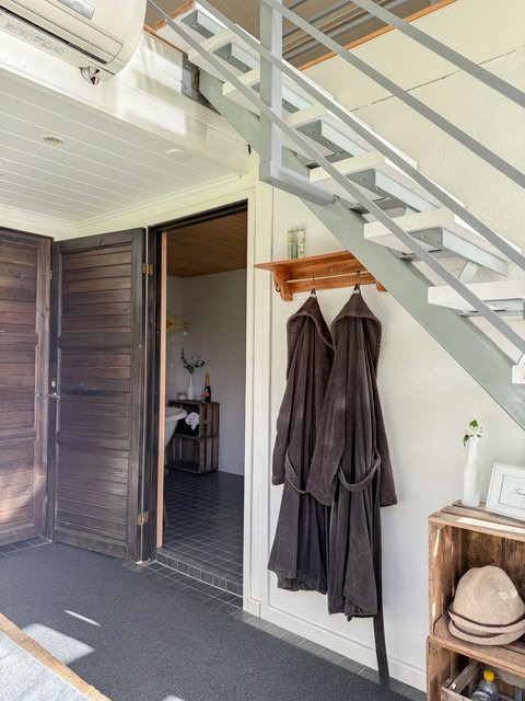 Mikä olisikaan täydellisempää, kuin tunnelmallisen, puulämmitteisen saunan löylyistä pulahtaa lämpimään paljuun tai virkistävään mereen? Saunarakennuksessa on takkahuone/ oleskelutila, ja suurista ikkunoista aukeaa upea merinäköala. Pesutiloissa on amme sekä suihku, ja puulämmitteinen sauna. Parvella on aula sekä makuuhuone, jossa voit majoittaa ystäviä. Rakennuksessa on lisäksi erillinen wc.
