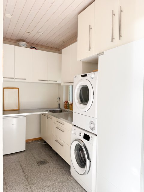 - Pesukoneliitäntä, tila pesutornille, pyykkikaapit, pesuallas, ja pöytätaso