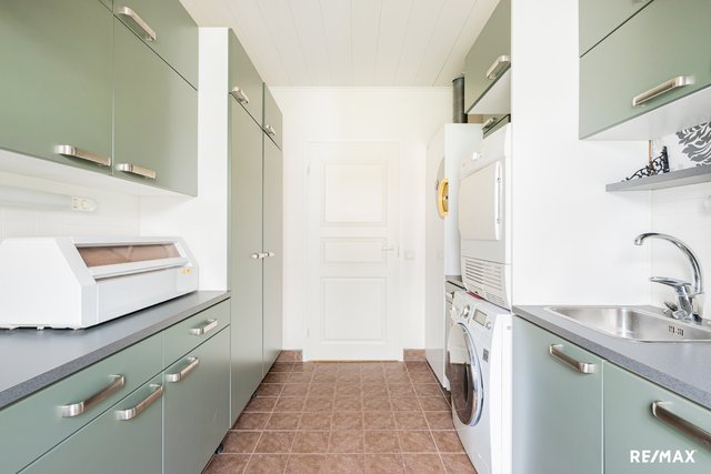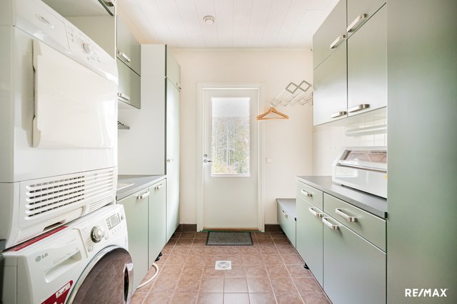 - Pesukoneliitäntä, pesuallas, pöytätaso, lattiakaivo, ja pyykkikaapit