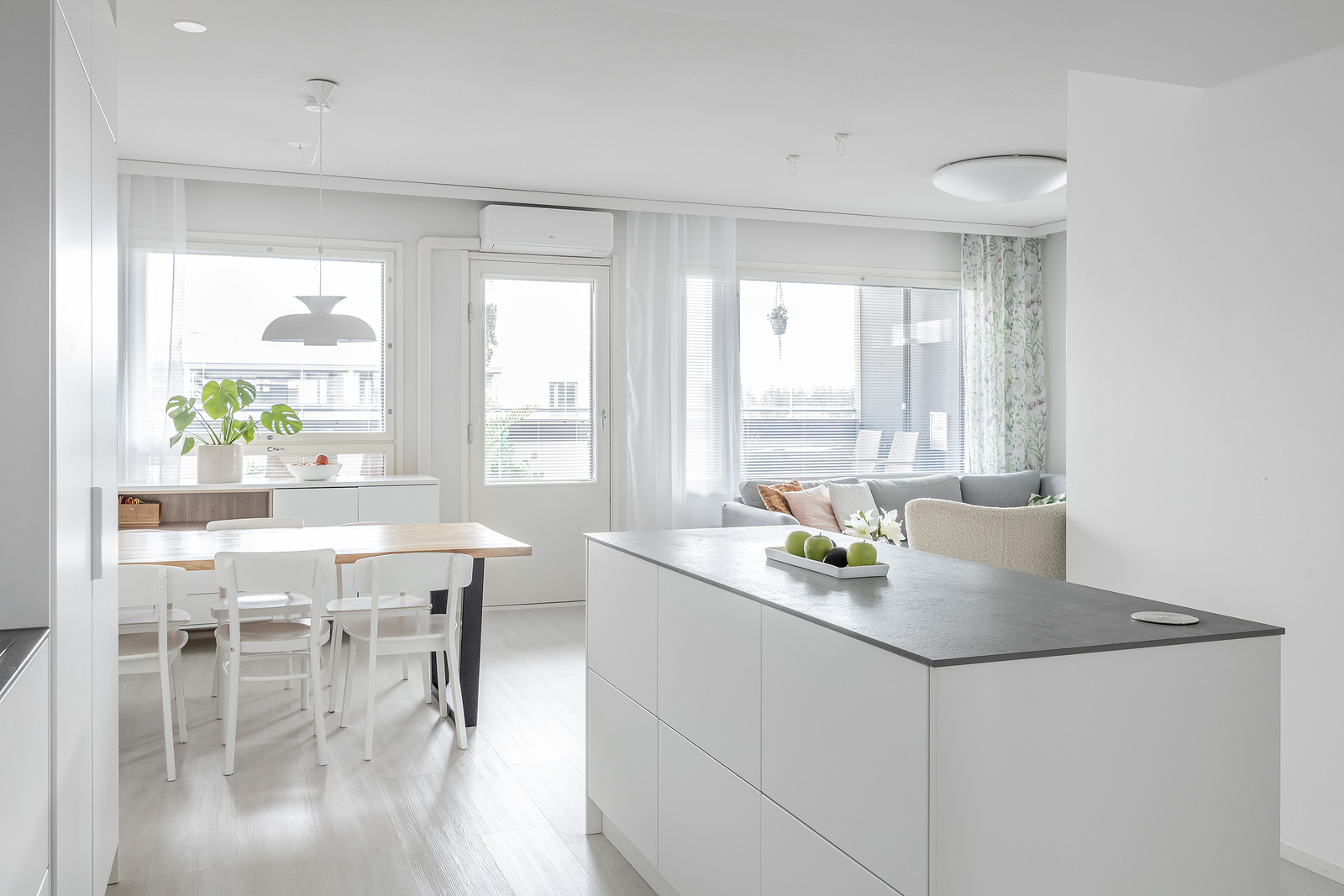 Tyylikäs ja toimiva keittiö ilahduttaa kotikokkia ja yhdistyy saumattomasti avaraan olohuoneeseen. Päämakuuhuoneesta avautuvat upeat näkymät yli kattojen Haltialan pelloille. Kaksi muuta makuuhuonetta jakavat kätevän vaatehuoneen, ja arkea helpottavat kaksi wc:tä. Kesällä asumismukavuutta lisää ilmalämpöpumppu.