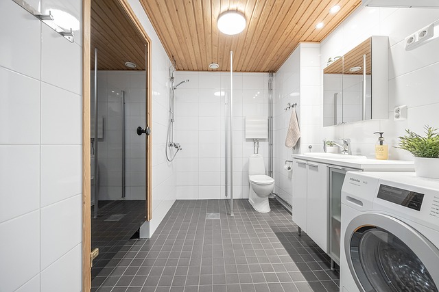 - Peilikaappi, alla, allaskaappi, suihku, suihkuseinä, pesukoneliitäntä, wc-istuin, käsisuihku ja IV-kone.