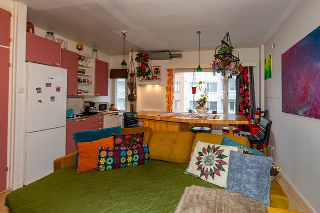 Laminaattilattiat ja maalatut seinät luovat modernin ilmeen, ja keittiö on varustettu kaikilla tarvittavilla kodinkoneilla. Asunnon kylpyhuone on laatoitettu ja siellä on liitäntä pesukoneelle. Taloyhtiöllä on myös autopaikkoja, jotka voi varata isännöitsijän kautta.
