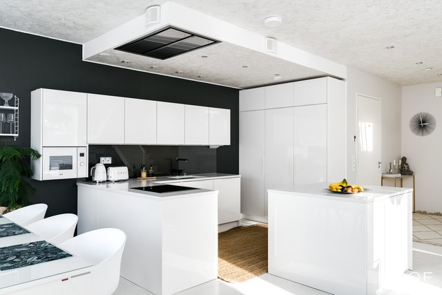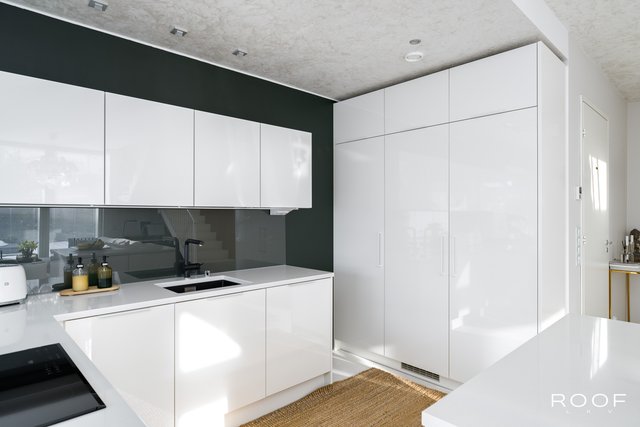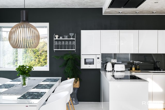 - Lattia mikrosementti, kvartsitasot, keittiö puustelli. Varustus: jääkaappi, pakastin, mikroaaltouuni, liesituuletin / hormi. Liesi: induktio, erillisuuni. Seinät: maalattu.