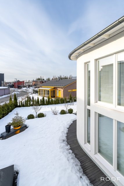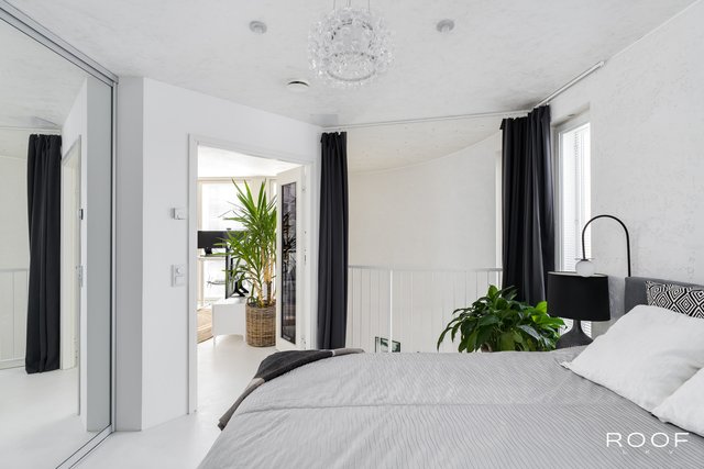 Toisessa kerroksessa on kolme makuuhuonetta, työhuone, aula ja wc. Työhuoneesta on käynti suurelle kaarevalle parvekkeelle.