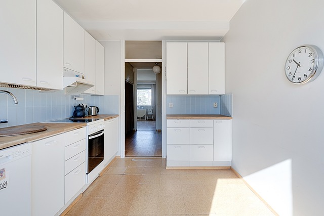 - valkoiset kaapistot, vaalean siniset välitilalaatat