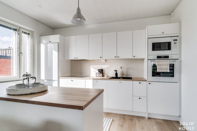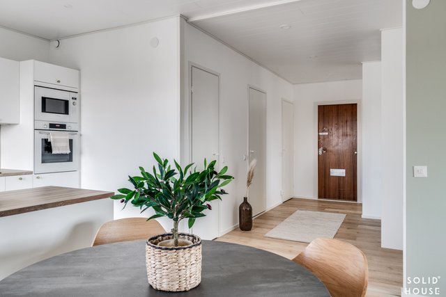 - Remontoitu kokonaan v. 2022, jolloin poistettu keittiön ja olohuoneen välinen seinä. Jääkaappipakastin, liesitaso (induktio), liesituuletin, mikroaaltouuni, uuni, astianpesukone, keittiösaareke. Työtasot laminaattia. Seinät maalattu. lattia vinyylilankkua.