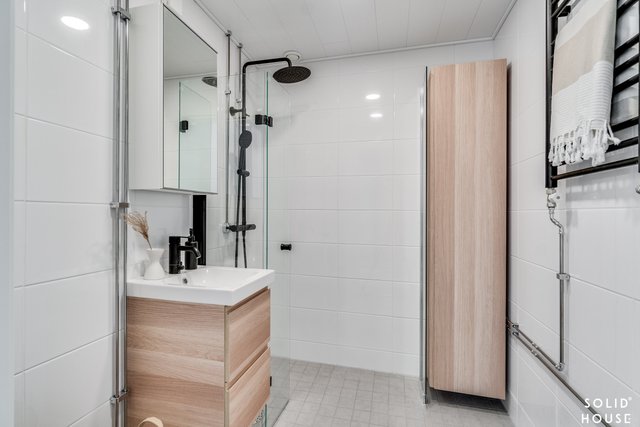 - Remontoitu kokonaan v 2022. Suihku, suihkuseinä, pesukoneliitäntä, allaskaappi, lattialämmitys, peili ja pesuallas. Seinät ja lattia laattaa.