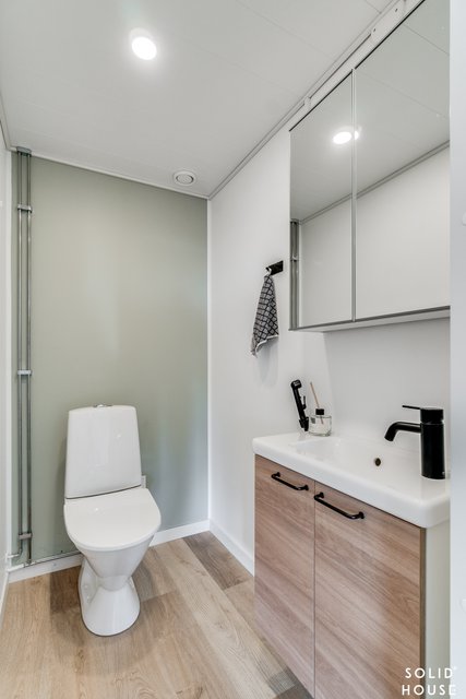 Kylpyhuoneessa on suihku ja pesuallas sekä tilaa myös pesutornille. Mukavuutta tuo myös erillinen wc.