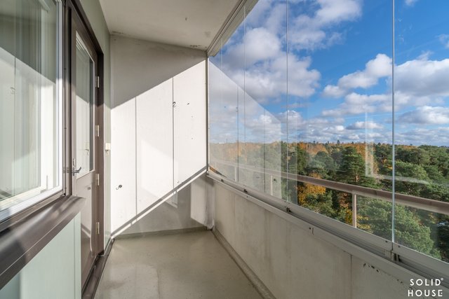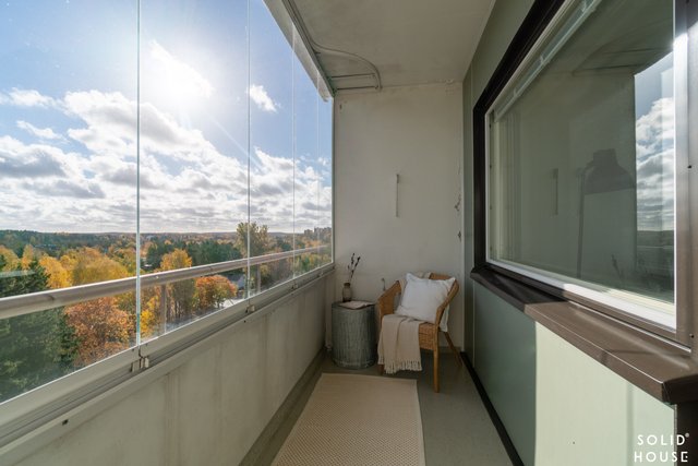 Ison olohuoneen jatkeena on lasitettu parveke, jonka rauhoittavasta näkymästä voi nauttia hyvillä mielin ympäri vuoden.
