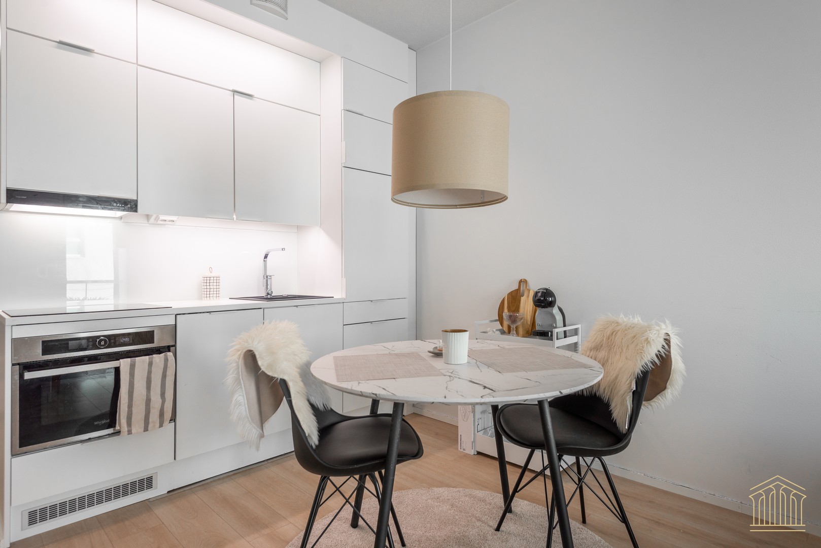 Huoneisto on toteutettu laadukkailla ja tyylikkään vaaleilla materiaaleilla kestämään aikaa. Keittiön varustelu on monipuolinen ja täyttää nykypäivän vaatimustason. Integroidut kodinkoneet mukaan lukien astianpesukoneen tuovat viimeistellyn lopputuloksen. Tilava kylpyhuone, jossa pesukoneliitäntä sekä asumismukavuutta tuova lattialämmitys takaavat asukkaan viihtymisen.
