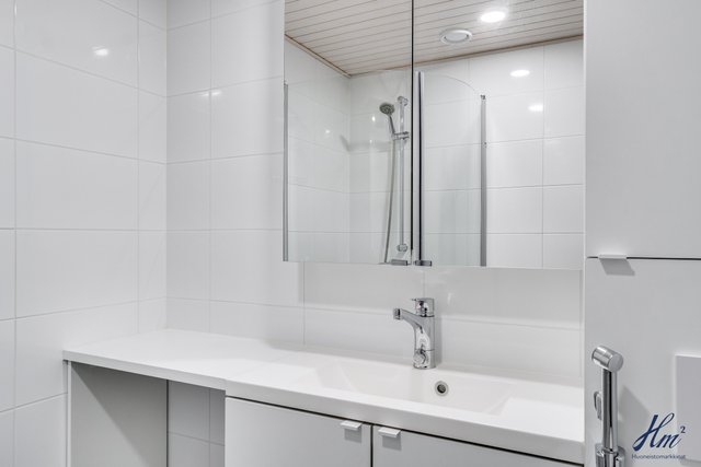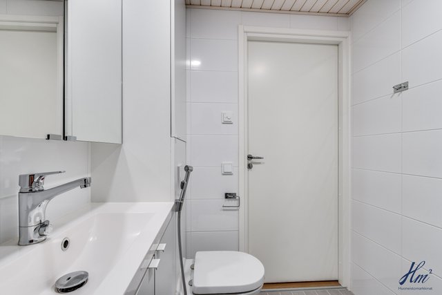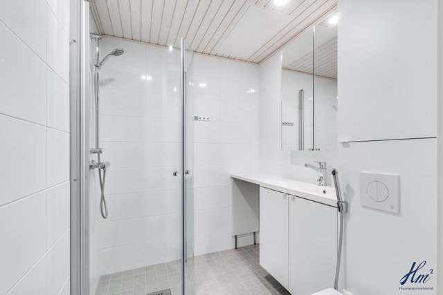 - Kokonaan laatoitettu pesuhuone / wc. allas, allaskaappi, kaapisto, suihkuseinät, pesukoneliitäntä ja lattialämmitys.