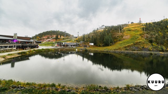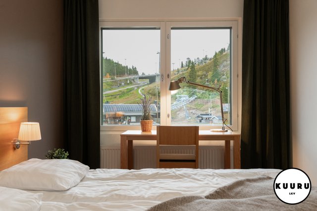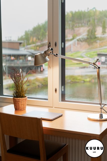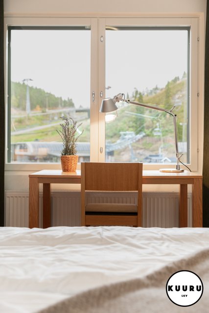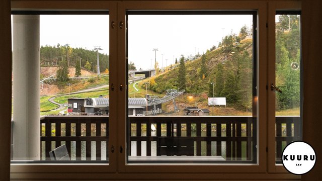 - Ikkunasta aukeaa kaunis näkymä Kaltiolammelle ja sen takana sijaitseville Rukan eturinteille.