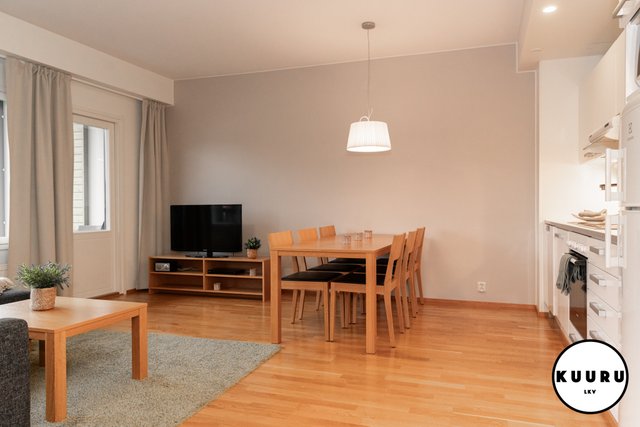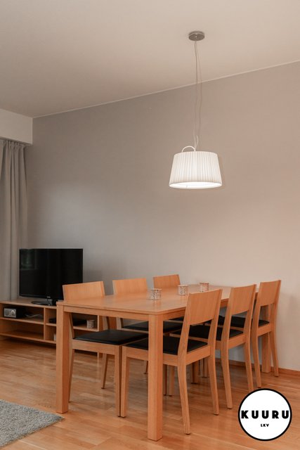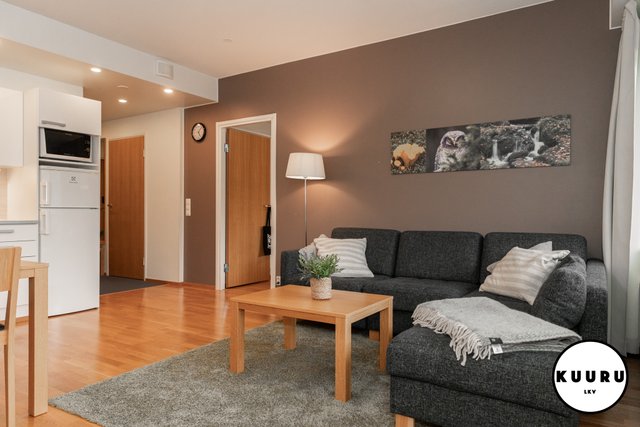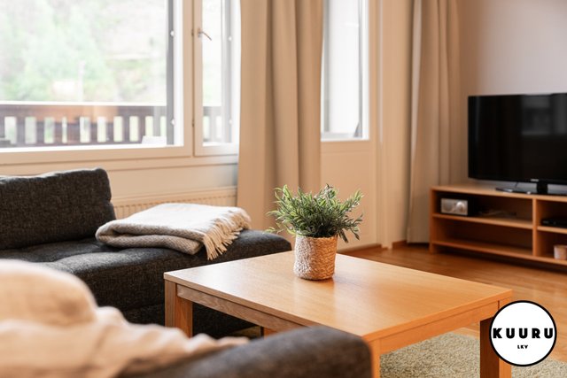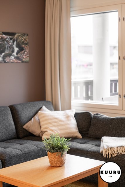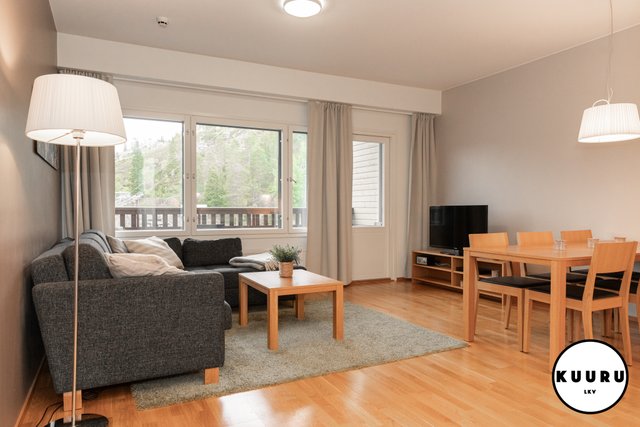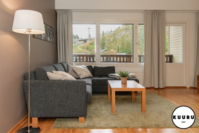 - Kauniin valoisa ja vaalean sävyinen olohuone on osa keittiön, ruokailutilan ja olohuoneen muodostamaa kokonaisuutta. Olohuoneesta käynti parvekkeelle ja ikkunoista avautuvat tunnelmalliset näkymät Rukan eturinteille.