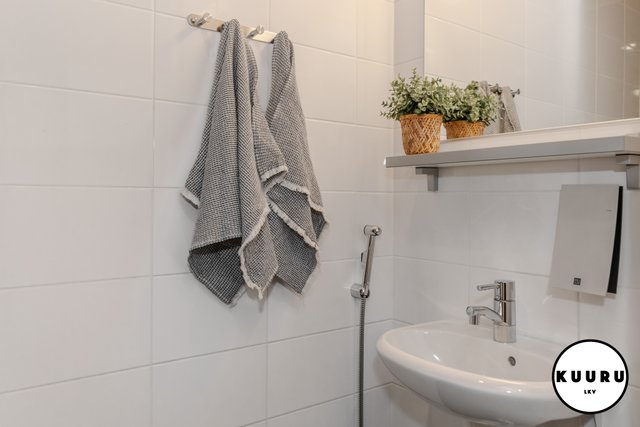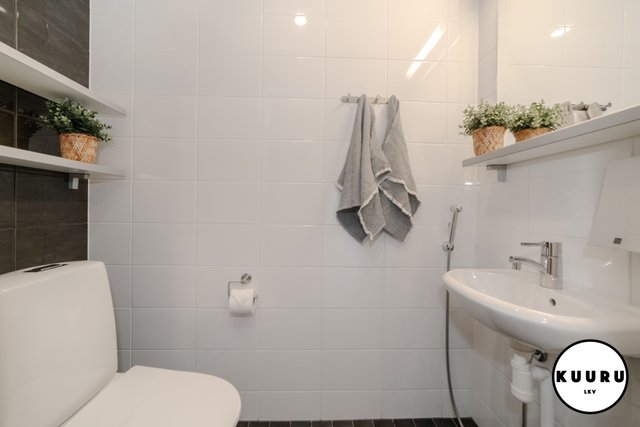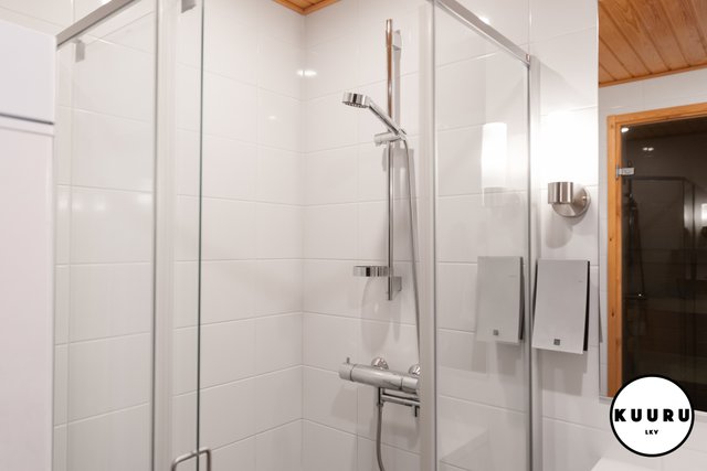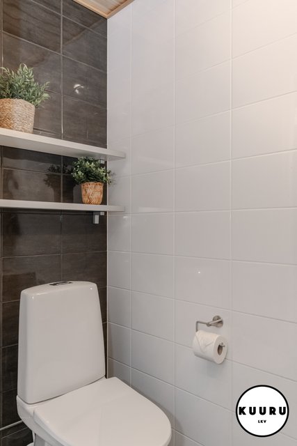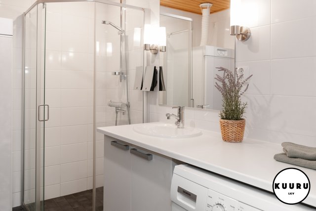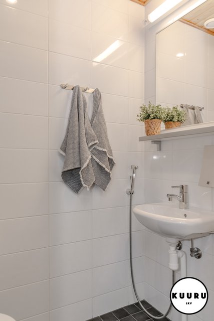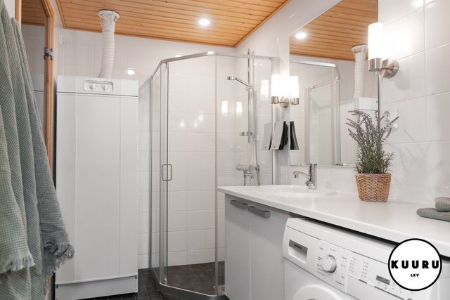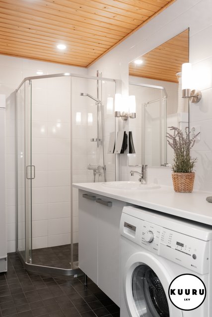 - Kauniin vaalean sävyiset pesutilat yhdessä saunan kanssa tarjoavat miellyttävät puitteet rentoutumiseen ulkoilupäivän päätteeksi. Pesuhuoneesta löytyy myös pesukone.