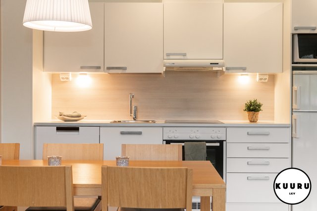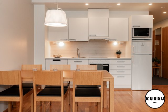 Lomahuoneiston tilat ovat avarat ja monikäyttöiset: valoisa olohuone ja avokeittiö muodostavat yhtenäisen tilan, jossa viihtyy suurempikin seurue. Olohuoneesta on käynti tilavalle parvekkeelle, jolta voi nauttia sekä maisemista että auringonnousuista. Toiminnallinen keittiö tekee ruoanlaitosta helppoa ja samalla mahdollistaa seurustelun muiden kanssa.