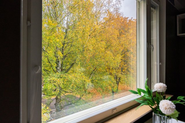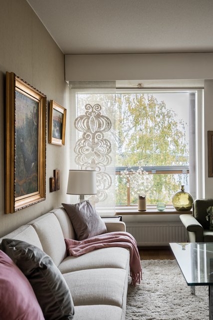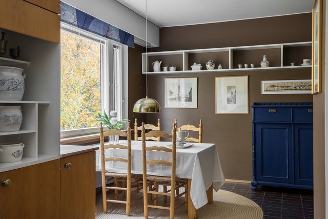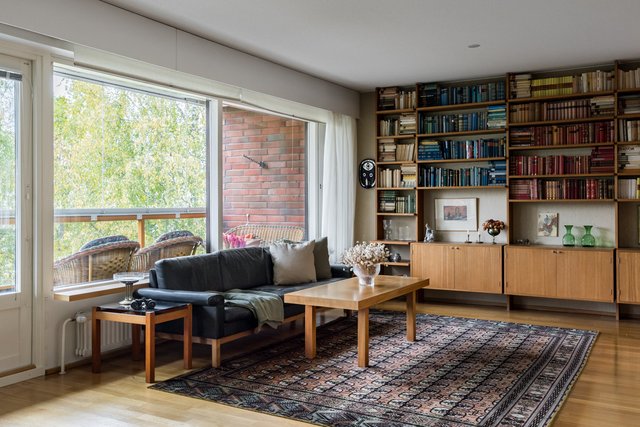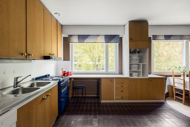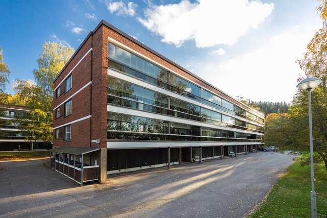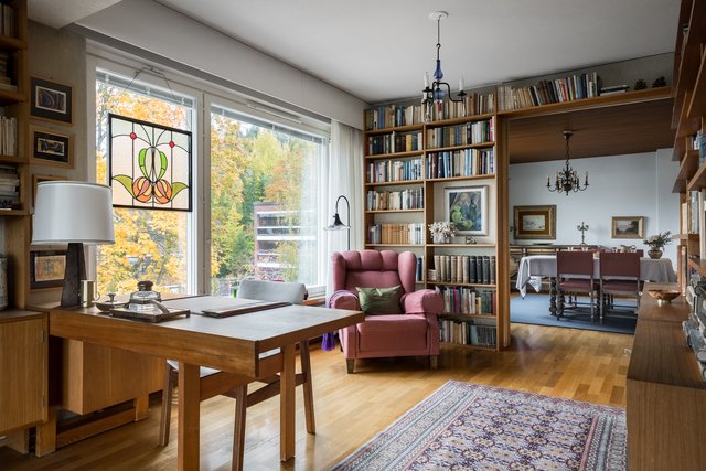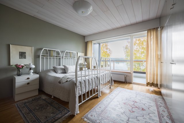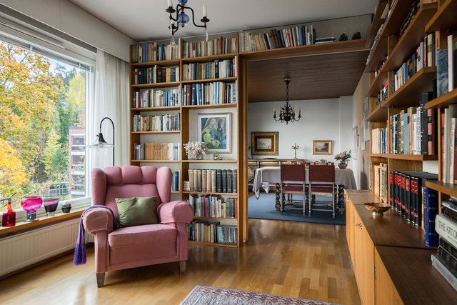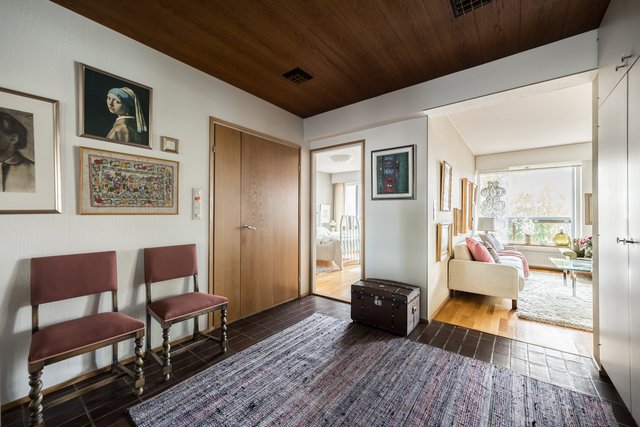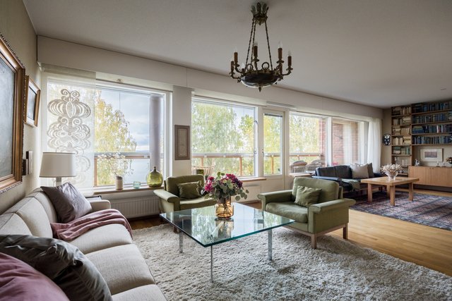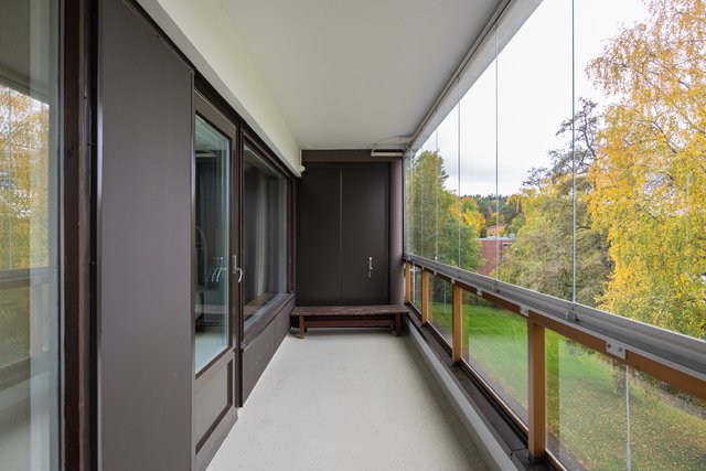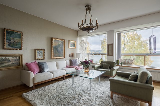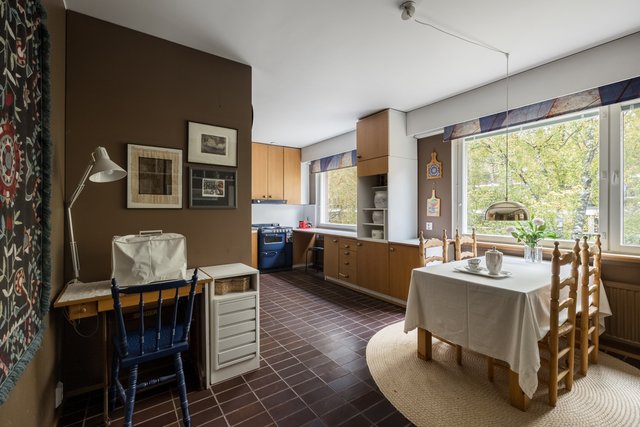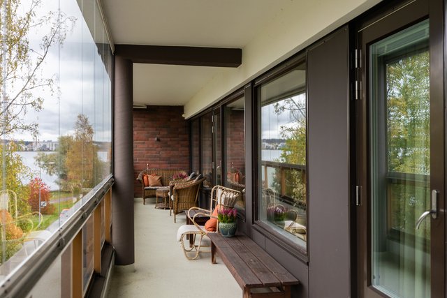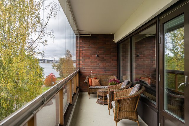 Loistava pohjaratkaisu, joka on helposti muokattavissakin elämäntilanteen mukaan. Koti hurmaa jo heti sisään astuttaessa avaralla tunnelmallaan ja kauniisti rytmitetyillä tiloillaan. Yhtenäiseksi, avaraksi tilaksi avautuva olohuoneen ja ruokatilan kokonaisuus ja koko asunnon levyinen lasitettu parveke ovat tämän kodin sydän. Täällä on tilaa niin perhe-elämälle kuin edustavalle seurustelullekin. Erillinen takkahuone on huikea ylistys -70-luvulle ja se kutsuu rentoutumaan. Asunnon makuuhuone on järven suuntaan. Suureen keittiöön on mahdollista tehdä vaikkapa erillinen kodinhoitotila niin hulppean kokoinen se on. Kylpyhuonetilat ovat ehtaa retroa ja niiden päivitys on varmaankin ajankohtaista.