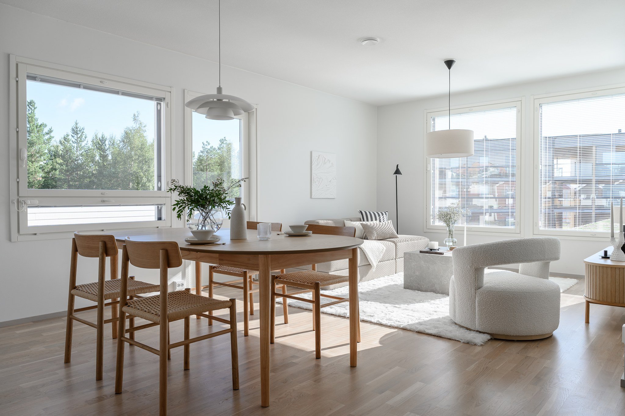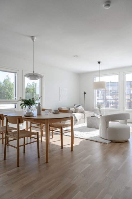 - Suuri ja valoisa olohuone yhdistyy näyttäväksi kokonaisuudeksi kodin yläkerrassa.