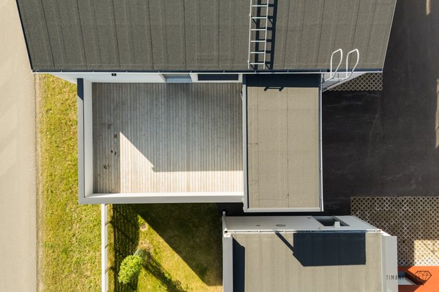- Hulppean kokoinen kattoterassi yläkerran keittiön ja olohuoneen jatkeena. Terassi on osittain katettu, johon myös mahdollista laittaa lasitus.
