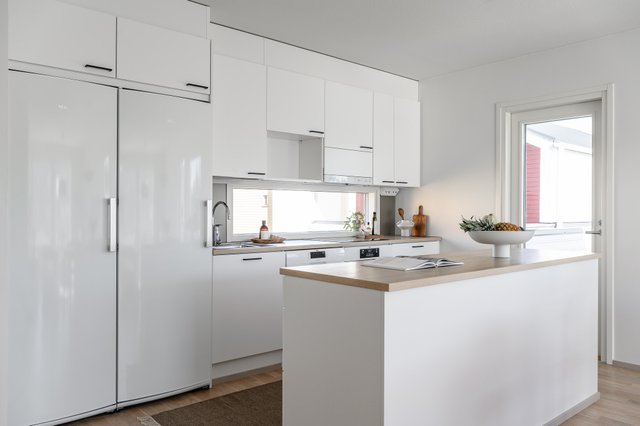 - Jääkaappi, erillinen pakastin, uuni, liesi, liesituuletin, astianpesukone, ja keittiösaareke