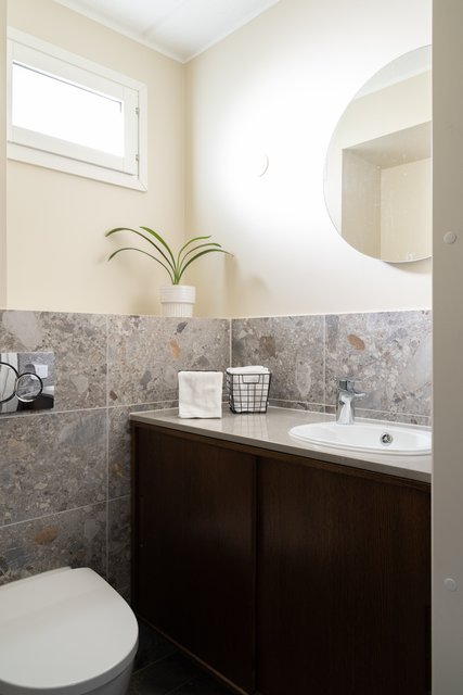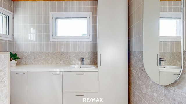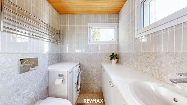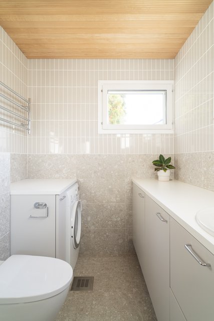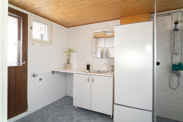 - Pesukoneliitäntä, pesuallas, pyyhekuivain / seinäpatteri, pyykkikaapit, pöytätaso, lattiakaivo, ja suihkuvaraus
