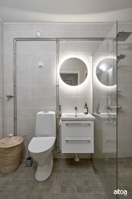 - WC-istuin, suihku, suihkuseinä, pesukoneliitäntä, peili (Peilivalaisin), pesuallas, allaskaappi, bidee-suihku, ja seinäkaappi