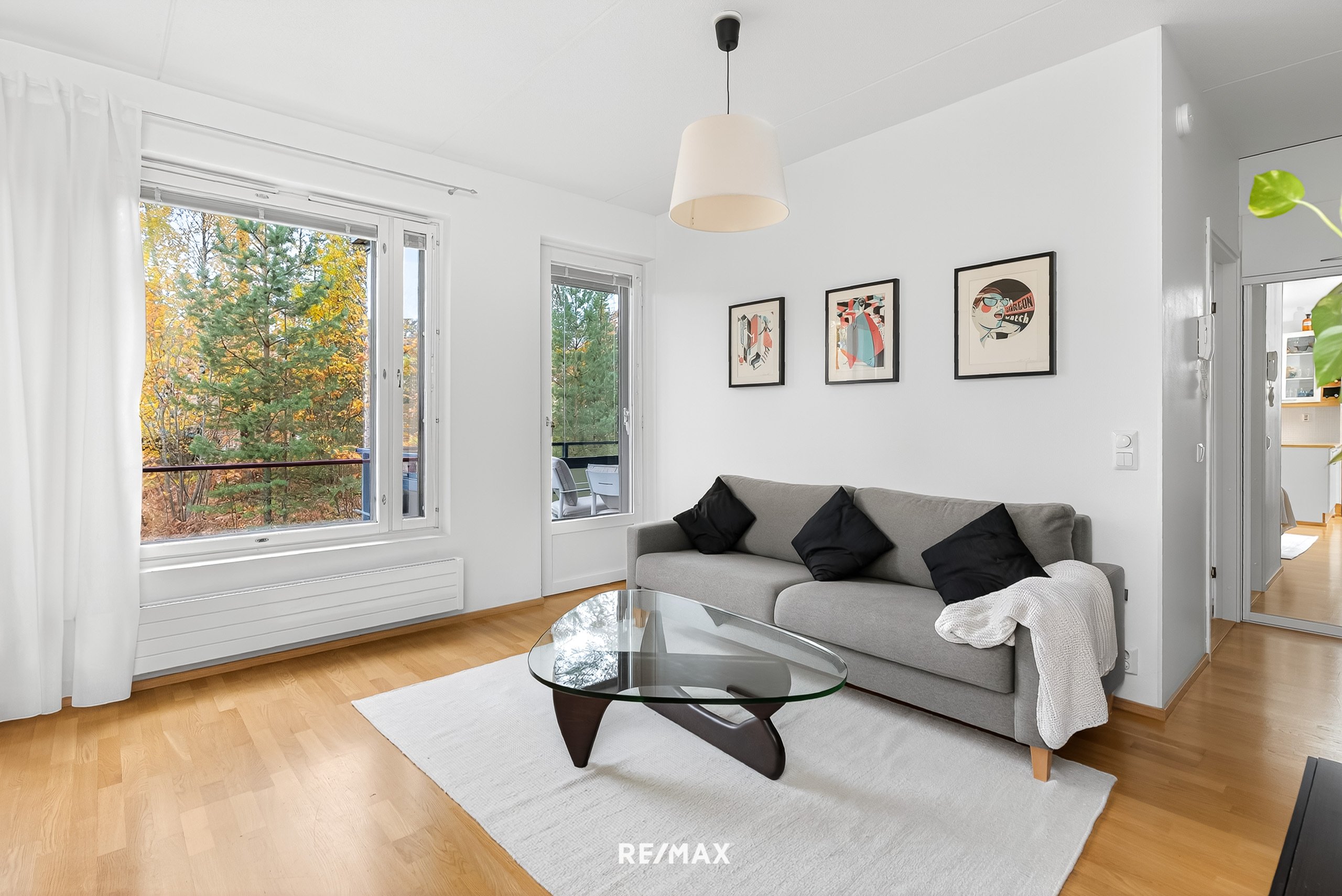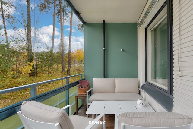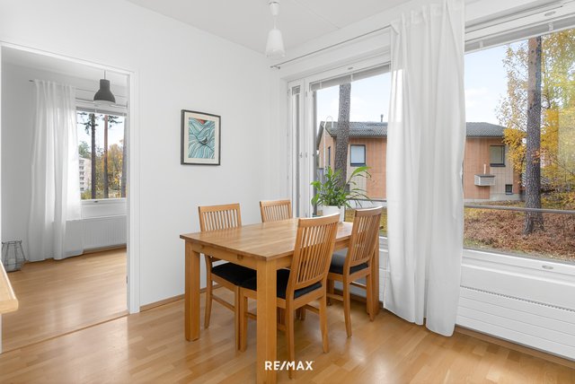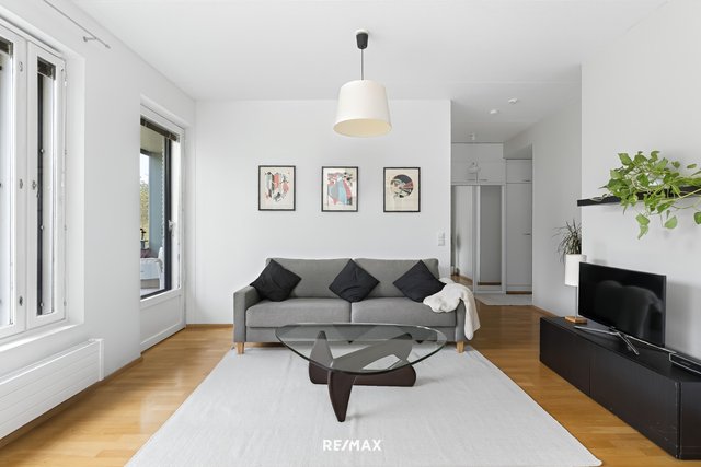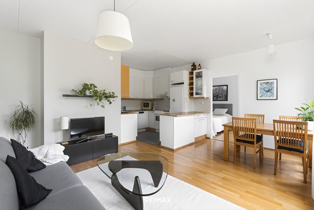 Asunnon sydän on avara olohuone, josta on käynti lasitetulle länsiparvekkeelle. Parvekkeelta avautuvat kauniit näkymät vehreille piha-alueille. Vaalea keittiö on avoin ja laskutilaa löytyy reilusti. Ruokailutila on olohuoneen suurten ikkunoiden äärellä ja näkymät ovat rauhaisat.