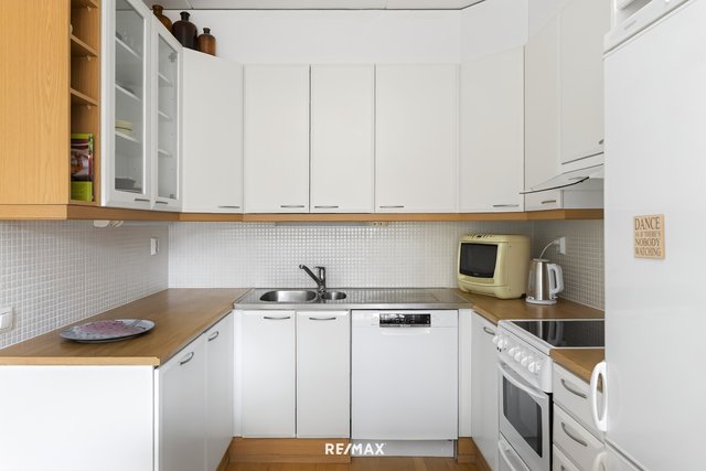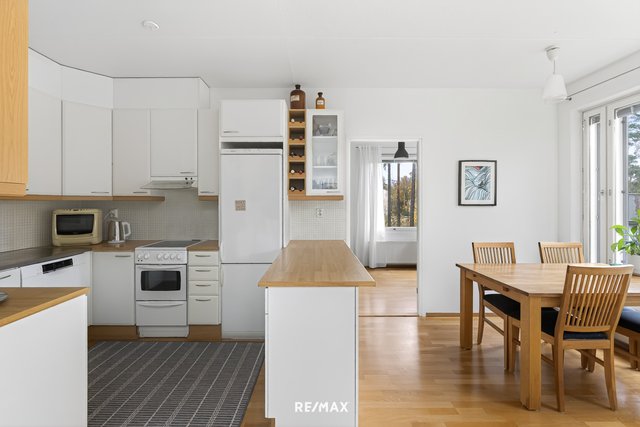 - Vaalea keittiö, jossa astianpesukone (Bosch 2020), jää/pakastinkaappi, keraaminen liesi, liesituuletin huippuimurilla. Välitilassa kaunis vaalea mosaiikkilaatta, työtasot puunväristä laminaattia. Lattia parkettia.