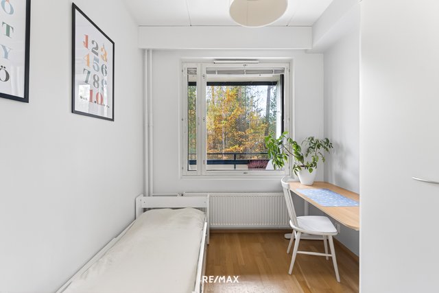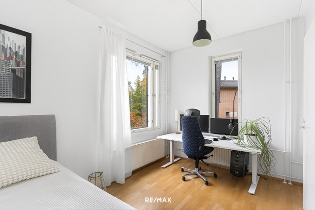Kaksi makuuhuonetta tarjoavat rauhalliset tilat levolle. Toinen makuuhuoneista on erityisen tilava ja ikkunoita on kahteen suuntaan sekä säilytystilaa koko seinän levyisissä liukuovikaapistoissa. Toinen makuuhuone on hieman pienempi ja sijaitsee omassa rauhassaan sisäänkäynnin puolella. Säilytystilaa tässä asunnossa on runsaasti useissa kaapistoissa sekä erillisessä verkkovarastossa.