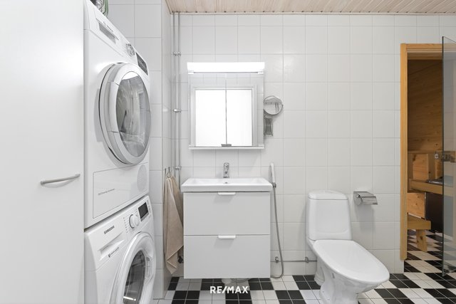 - Kylpyhuoneessa suihku, lasitiilistä tehty suihkuseinä, peilikaappi, allaskaappi(uusittu 2025), wc-istuin, bidee-suihku, pesukoneliitäntä ja tilaa pesutornille, korkea kaappi. Seinät ja lattia laatoitettu, lattialämmitys.