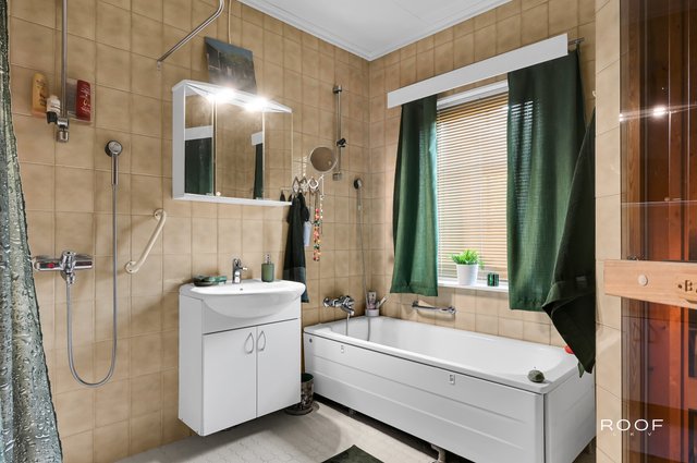 - WC-istuin, kylpyamme, suihku, lattialämmitys, allaskaappi, bidee-suihku, ja peilikaappi