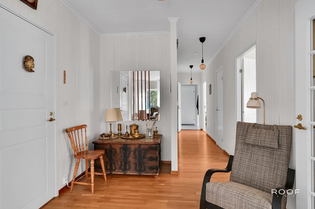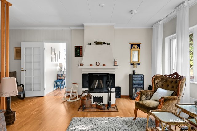 Tilavassa olohuoneessa on takka ja myös keittiössä on mukavasti lämmittävä puuhella. Kaksi makuuhuonetta ja vaatehuone. Kylpyhuoneen yhteydessä on myös sauna. Kodinhoitohuoneessa erillinen wc.