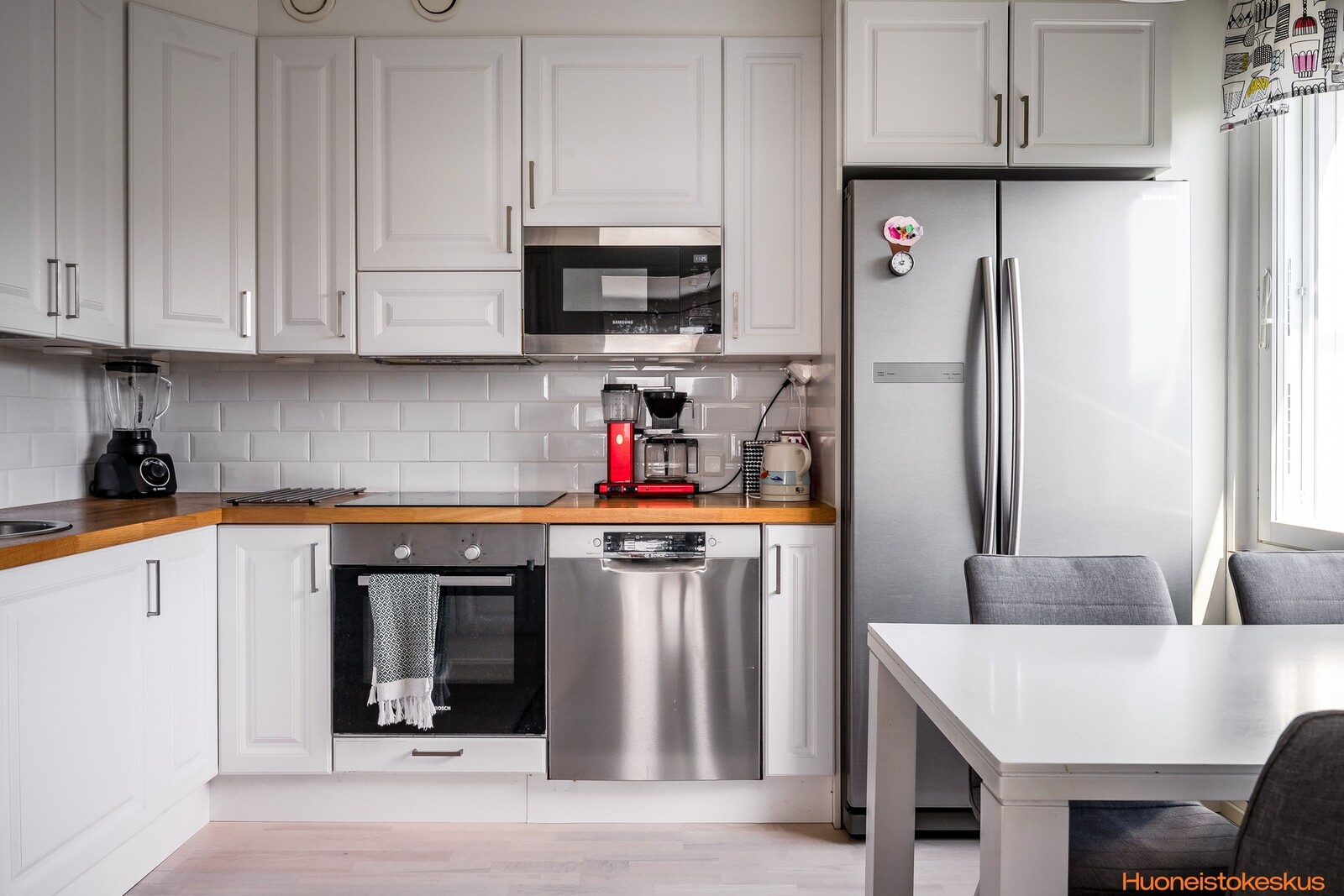 - Astianpesukone, erillisuuni, erillinen pakastin, liesituuletin, jääkaappi, mikroaaltouuni, ja kiinteät valaisimet