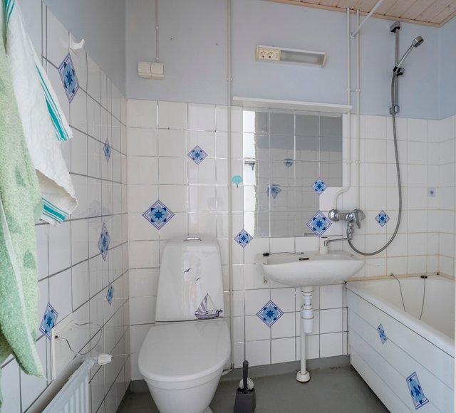 - Kylpyamme, suihku, pesukoneliitäntä, peili, pesuallas, ja wc-istuin