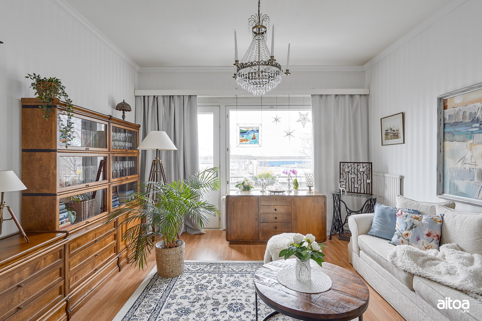 Kotkan keskustassa, meren ympäröimällä Kotkansaarella, sijaitsee tämä valoisa ja tilava 96,5 m²:n asunto. Vuonna 1938 valmistuneen talon asunto on neljännessä kerroksessa, jossa hissille on vain muutama porras. Läpitalon valoisa asunto, korkeine huoneineen tarjoaa väljät ja reilut tilat perheelle. Asunnossa on kaksi parveketta, joissa voit nauttia aamukahvia tai rentoutua työpäivän jälkeen.
