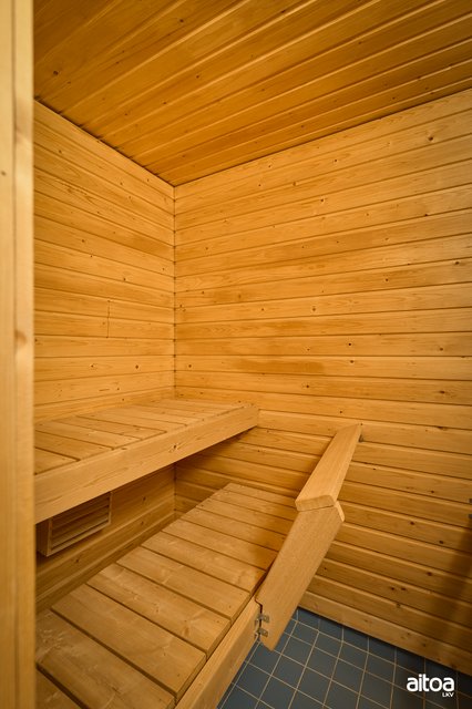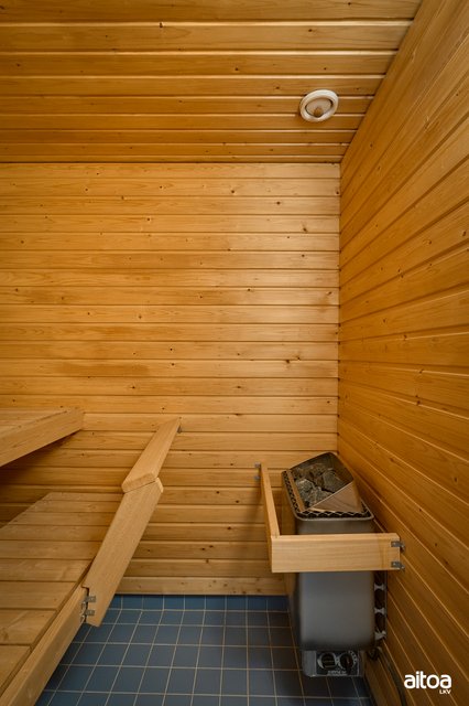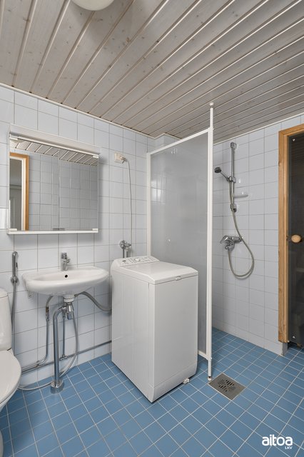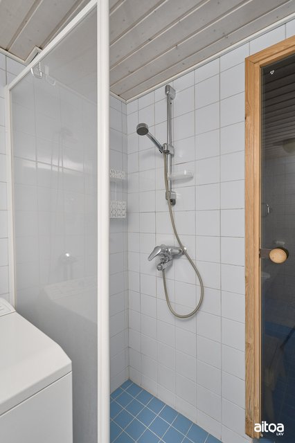 - WC-istuin, suihku, peilikaappi, pesuallas, bidee-suihku, lattialämmitys, pesukoneliitäntä, ja suihkuseinä