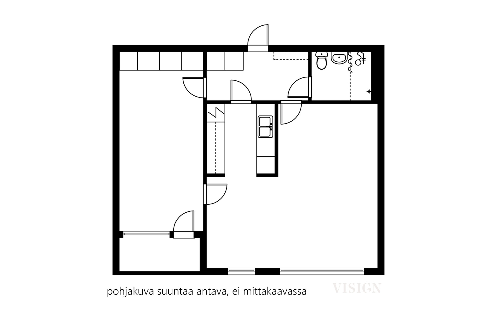 - Yhtiöjärjestyksen ja isännöitsijäntodistuksen mukainen pinta-ala on 51 m². Pinta-alaa ei ole tarkistusmitattu. Mainittu pinta-ala saattaa tämän ikäisessä kohteessa poiketa olennaisesti nykyisten standardien mukaan laskettavasta asuinpinta-alasta. Todellinen asuinpinta-ala voi olla yhtiöjärjestyksessä, isännöitsijäntodistuksessa ja esitteessä mainittua pienempi tai suurempi.