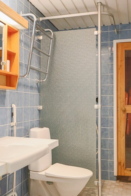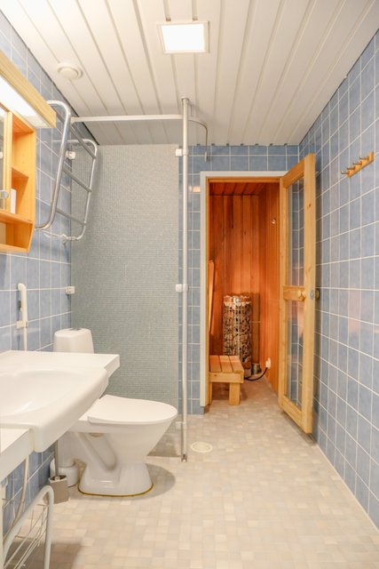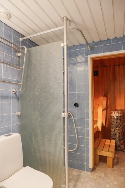 - WC-istuin, suihku, suihkuseinä, peilikaappi, pesukoneliitäntä, pesuallas, allaskaappi, ja bidee-suihku