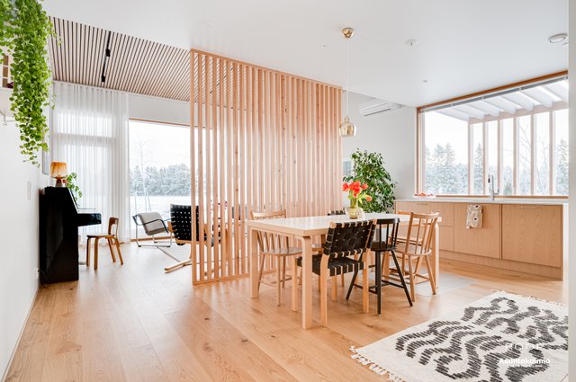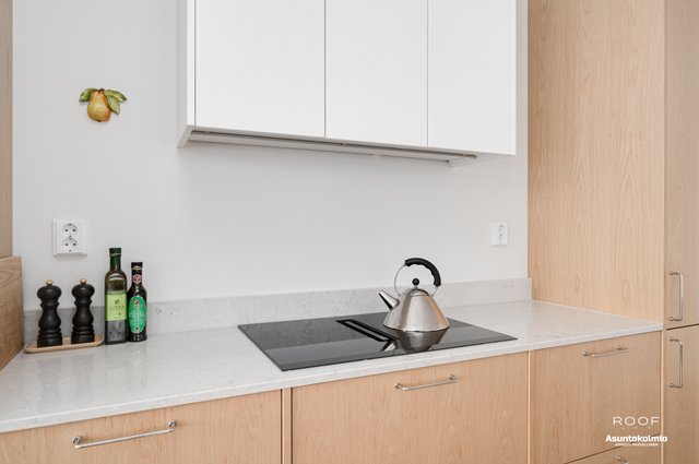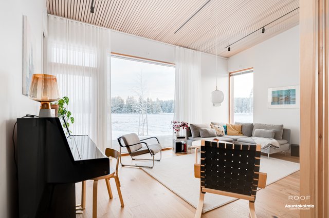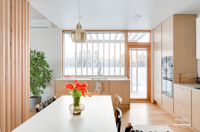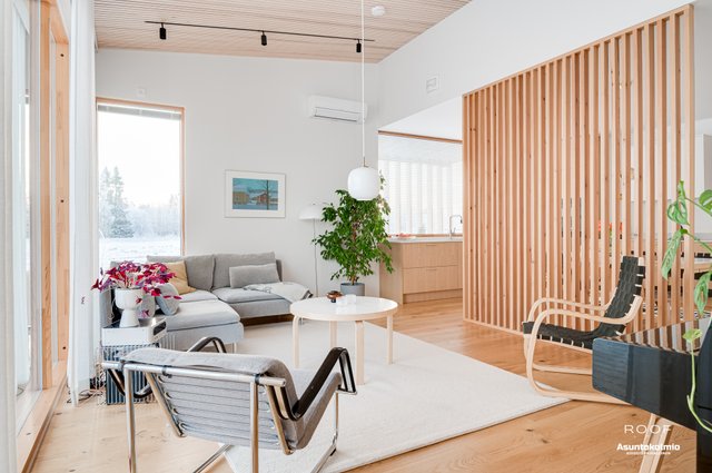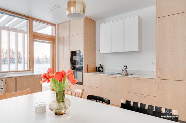 Tervetuloa Kempeleen Tähkälään, tähän vuonna 2024 valmistuneeseen 106m2 kotiin, josta ei puutu juuri mitään. Arkkitehti Nelly Isopahkalan suunnittelema kokonaisuus on poikkeuksellisen upea niin suunnittelultaan kuin materiaalivalinnoiltaankin. Keittiön kalusteet ovat laadukasta Puustellia, kaappien ovet puuviilua, työtasot vaaleaa kvartsia ja kodinkoneetkin luonnollisesti laadukkaita. Keittiöstä löytyy myös monen toivoma aamiaiskaappi, ja ruokailutilaa sekä olohuonetta jakaa näyttävä rimaseinä. Kuivien tilojen lattiat ovat todella laadukasta yksisauvaista tammiparkettia, eikä laattavalinnoissakaan ole tyydytty tavanomaiseen. Arjen sujuvuutta lisäävät erillinen kodinhoitohuone, reilun kokoinen arkieteinen omalla sisäänkäynnillä ja vesipisteellä sekä erillinen wc.