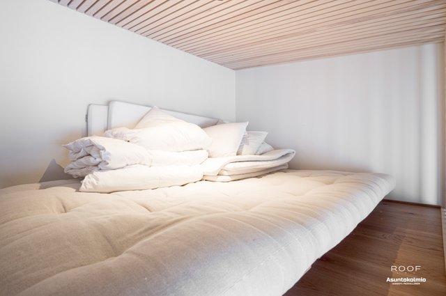 - Takapihan puolesessa makuuhuoneessa kiinteä reilun kokoinen parvi