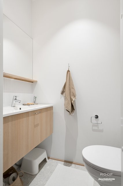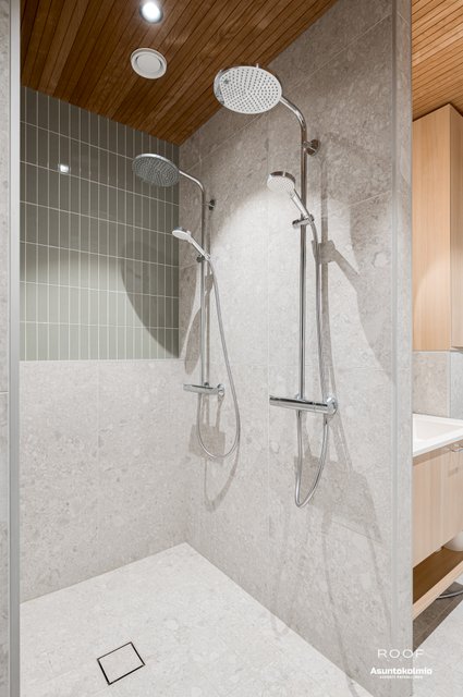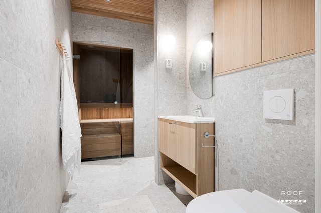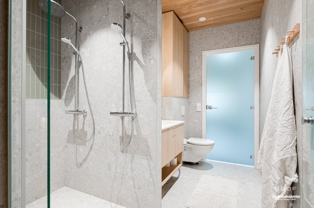 - Suihku (sadesuihku x2), wc-istuin, pesuallas, allaskaappi, peili, ja bidee-suihku