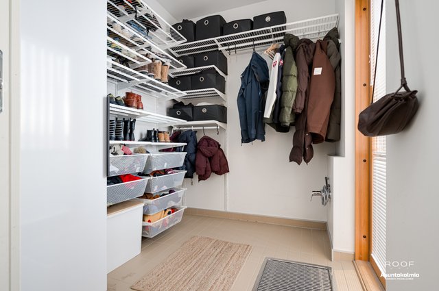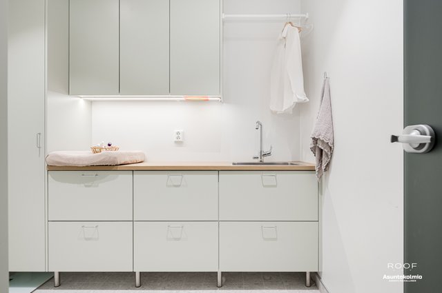 - Arkieteisessä vesipiste, kurasieppari ja kiinteät säilytysjärjestelmät. Eteisessä laattalattia ja kiinteät kaapistot.