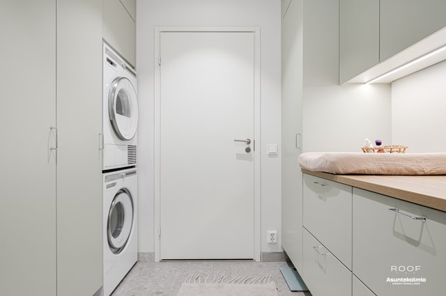 - Pesuallas, pesukoneliitäntä, ja tila pesutornille