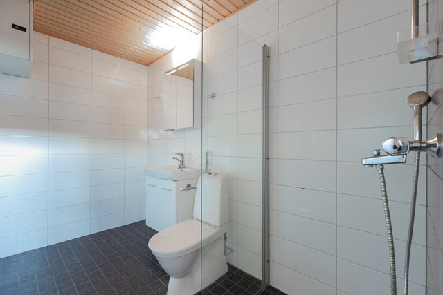 - WC-istuin, suihkuseinä, pesukoneliitäntä, lattialämmitys, peilikaappi, pesuallas, allaskaappi, ja bidee-suihku