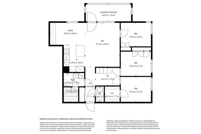 - Ei tarkistusmitattu. Pinta-alat saattavat tämän ikäisissä kohteissa (yhtiö rekisteröity ennen 01.01.1992) poiketa olennaisestikin asuinrakennusten nykyisten mittaustapojen ja standardien (SFS 5139) mukaan laskettavasta asuintilojen pinta-alasta. Pinta-ala voi siis olla edellä mainittua pienempi tai suurempi.