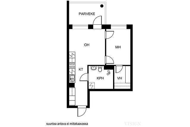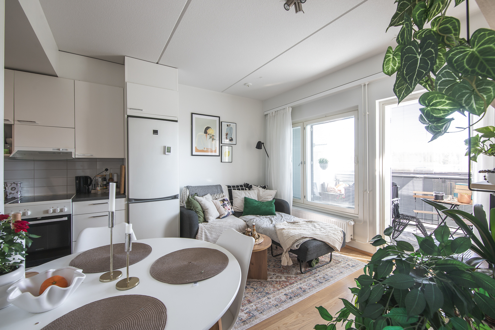 Pohjaratkaisu on toimiva, keittiö on sopivan kompakti paketti, tilavaan ja valoisaa olohuoneeseen sopii myös ruokailuryhmä, makuuhuone on hyvänkokoinen. Kylpyhuoneessa on hyvin tilaa myös pyykkihuollolle.